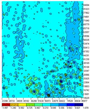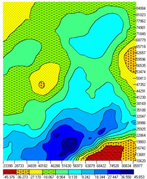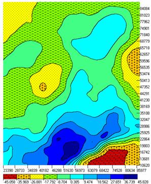 Время счета каждого эксперимента составляет 41 минуту при процессоре 1000 мегагерц. Анализируя таблицу, видим, что с увеличением абсолютной отметки подошвы увеличиваются минимальные (от 1.169 до 2.41) значения плотностей и уменьшаются максимальные (от 3.6 до 2.96). Несмотря на значительное изменение подошвы (от 1000 до 10000 м) и при наличии сильных аномалий на краях в результатах нет видимых искажений, связанных с краевыми эффектами. По результатам анализа в качестве исходного для дальнейшей обработки примем вариант, в котором Z=5000 м. Для этого варианта приведем сопоставление исходного поля и подобранного при решении обратной задачи. Как видно (рис.1), исходное и подобранное поля практически не отличаются. Разности полей приведены в кадре В. В разности отличия в основном локального характера. Для иллюстрации возможностей пакета на рис.2 показаны гравитационное поле и трехмерная модель среды. Авторы выражают благодарность руководству Гравиметрической экспедиции №3 за поддержку в создании технологии. Рисунки.Рис 1 Сравнение исходного и подобранного полей.