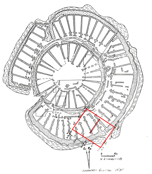 Arkaim, the fortified settlement dated to 1600–1700 B.C., was discovered in 1987 [1]. It is situated 8.2 km north–north–west of Amurskiy, and 2.3 km south–south–east of Alexandronvskiy in the Chelyabinsk region, Russia. “The excavation revealed that the settlement had been burned and, therefore, many details were preserved. The population, however, had vacated the city before the fire and took all their possession with them. Arkaim had two protective circular walls and two circles of standard dwellings separated by a street around a central square. The external wall, 160 m in diameter and 4 m wide, was built from specially selected soil that had been packed into timber frames before being faced with adobe bricks. On the interior, houses abutted the wall and were situated radially with their doors exiting to the circular internal street.” [7] The site plan is shown at Fig.1.