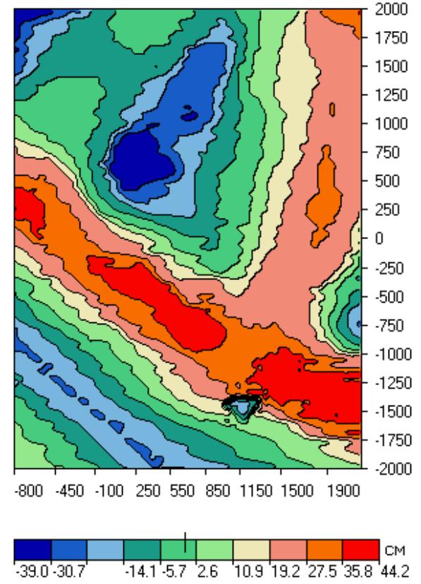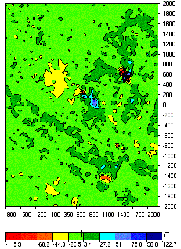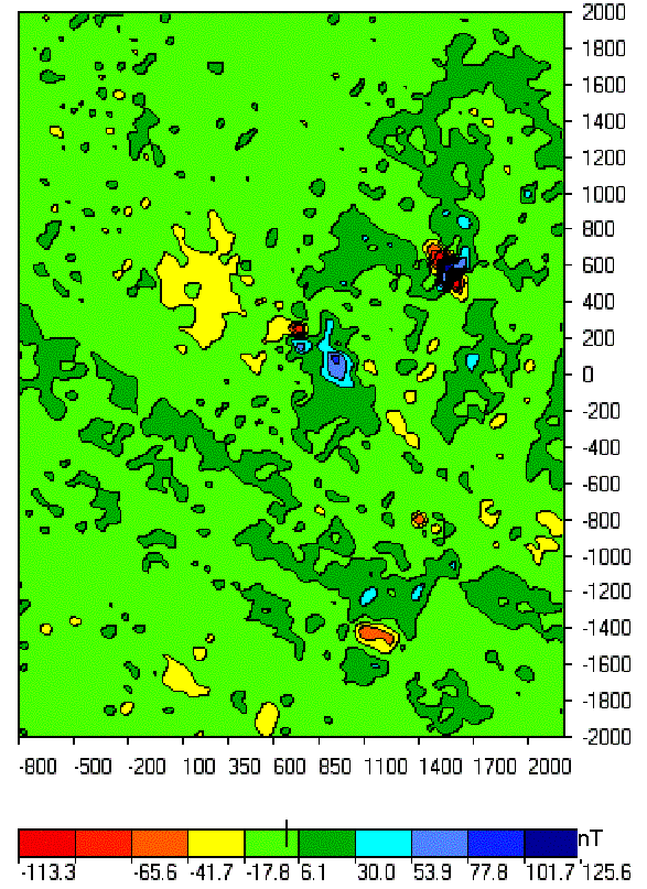The initial magnetic field (in 10-colors palette) is shown in Fig.3. Negative values are in red colors, positive – in dark-blue. We can see two strips of positive anomalies which coincide with the direction of convex relief forms. The limits of the field vary from –116 to 123 nT. Rectangular forms of slight positive anomalies can be discerned in the background (in dark green) We can also single out two strong anomalies of the complex form. The first is located in the central part (profile 0), the second one is situated to the north. (It should be taken into consideration that the anomalies go from South to North almost bias from the bottom left corner to the top right corner) On the profile –1500 we can see a negative anomaly, caused by a natural deepening. Two areas with the calm field (yellow spots in the lower and central parts of the figure) should also be focused at.