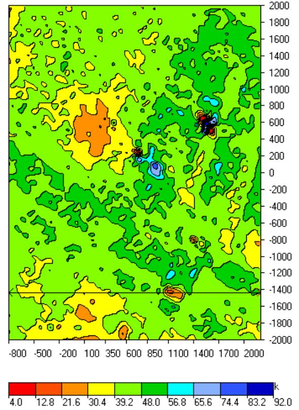 The distribution of the magnetic susceptibility in the second layer is shown in Fig.6. One can trace here the same features noted before but in a smoother form. The magnetic susceptibility of the third layer (shown here in the individual local palette) we can see in Fig.7. The range is from 28*10-5 to 51*10-5 SI.
