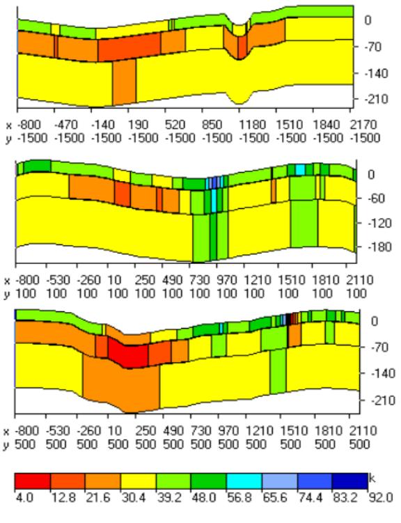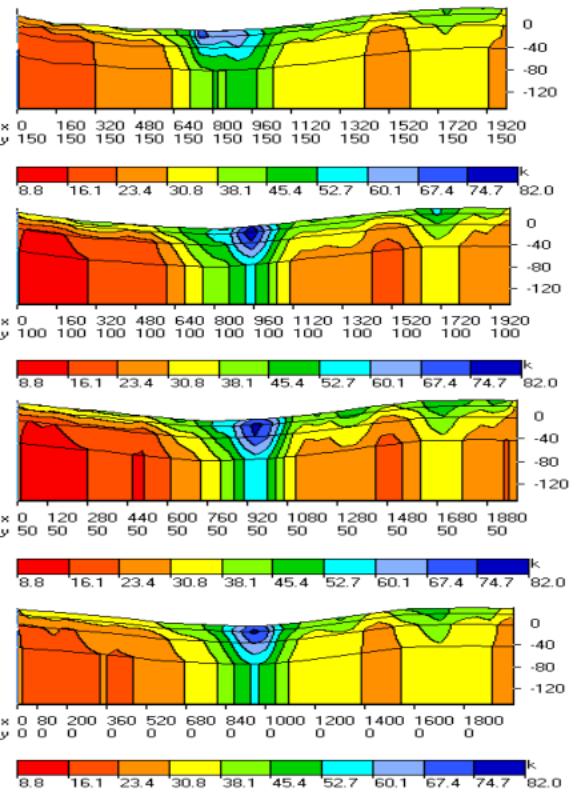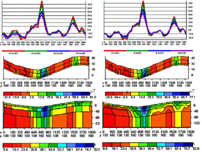 Let us further look at the most interesting sections first in the left-to-right, and then in the bottom-to-top direction. On the upper sequence of Fig.9 we see a section along the profile –1500, passing through a negative anomaly, which is located to the south of the bank. Note two specific features. The upper layer has high magnetic susceptibility while the lower level is characterized by low magnetic susceptibility. This is especially visible in the area of the decline in the relief.