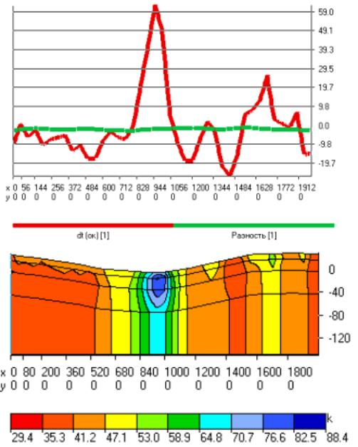 In order to solve the inverse problem it is necessary to assign the initial approximation of model. The solution can be found while applying the problem to the single-layer model, but it proves to be unstable. Minimum discrepancy occurs at the first iteration, but it increases at the iterations following the first one. (Discrepancy is the difference between the original and modeled values of field). After a number of experiments, we accepted the three-layered model of medium with the boundaries of the layers imitating the surface relief. The layers were 30, 60 and 120 cm thick. Thus, the total thickness of model was 210 cm. It was assumed that magnetic susceptibility for all layers is 50*10-5 SI, and the initial approximation error is 10*10-5 SI.