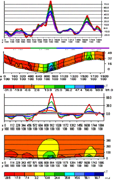 In the small section of 20x1.5 m geophysicists carried out the survey of magnetic field on 4 levels: on the surface, 5, 15 and 25 cm above the surface with a sampling interval 50 cm. The initial and modeled magnetic fields are shown in Fig.11, initial and modeled curves are in Fig.12. Let’s look at sections (Fig.13) and compare them with the results obtained with level 1of the survey (Fig.14). They somewhat differ.